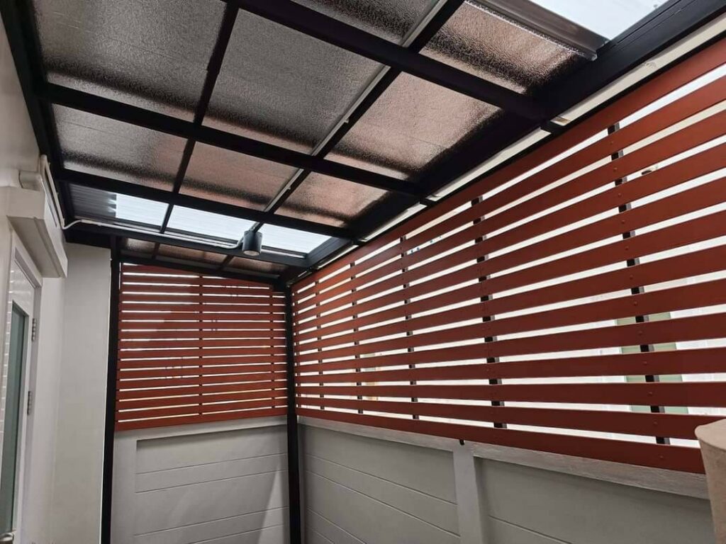 หลายคนชอบอารมณ์ของงานไม้ แต่กลัวปัญหาปลวกกินหรือไม้ผุเมื่อโดนฝน เราจึงเลือกใช้ ไม้เทียม (Fiber Cement) หรือไม้สังเคราะห์เกรดเอในการติดตั้งครับ วัสดุชนิดนี้ถูกออกแบบมาเพื่อใช้งานภายนอกโดยเฉพาะ มีความเหนียว ทนแดด ทนฝน และที่สำคัญคือ ‘ปลวกไม่กิน 100%’ หมดกังวลเรื่องการดูแลรักษาไปได้เลย เรานำมาทำสีเลียนแบบไม้ธรรมชาติ (เช่น สีสัก, สีโอ๊ค, หรือสีแดงมะฮอกกานี) ให้ความรู้สึกสวยเนี๊ยบเหมือนไม้จริง ติดตั้งบน โครงเหล็กกล่อง ที่ทาสีกันสนิมและสีน้ำมันทับหน้าอย่างดี (นิยมใช้สีดำด้านเพื่อตัดกับสีไม้) ทำให้โครงสร้างแข็งแรง ไม่โยกคลอนเมื่อเจอลมพายุ ใช้งานได้ยาวนานนับสิบปี
